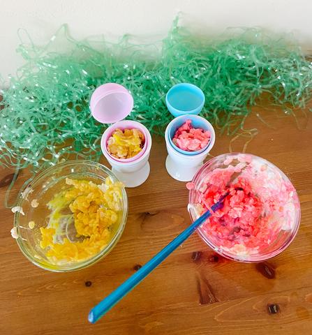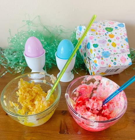 Take food dye and stir it in the 2 bowls of marshmallow and butter mixture. We did yellow and pink for our eggs!