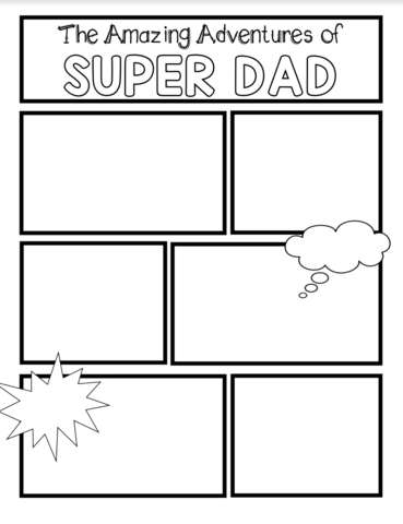 As I thought about that, I don’t think that there are many father-figures that realize that they are the heroes in these little peoples lives. So I began thinking, what can we do this weekend to change that idea? There’s the traditional footprint art work, the poem that says “dad is stronger than the Hulk”, etc. Something that I have not seen done often however, is the creation of developing a story that shows “The Adventures of Super Dad”. So here is a comic strip template. Use it to write your own comic strip that displays your dad, uncle, grandfather, or whom ever you would like to honour during this day as the hero who faces a challenge and saves the day. What super powers would he have? What does his superhero costume look like? Are there evil forces that he needs to battle? Write an adventure story for your dad – and don’t forget the happy ending!