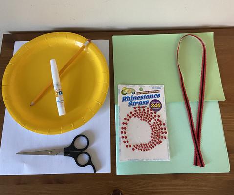 I hope you and your kids enjoyed making a wreath together. Feel free to decorate with anything you want. I used gems and a bow! You can add a ribbon to the top of your wreath to hang it up, or you can leave it to put up on your wall. Happy crafting!