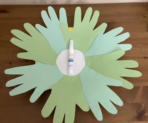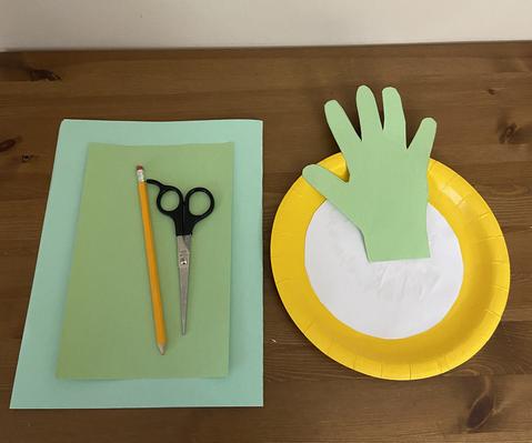 Continue by tracing your kid’s hands onto your green pieces of paper. You should have 4 or more of each colour of green traced. You’re then going to cut out your hands you traced.