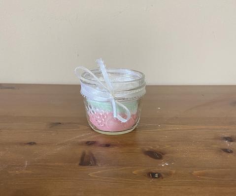 Next you can take your powder and colour it different colours. I choose to do red, green and leave some white. Pour it into the jar in any pattern you choose.