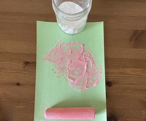 First start by, pouring your powder or crystal substance onto your paper. Do small amounts each time, to prevent a mess. I used baking powder to do mine. Take your chalk and colour the powder on the paper. The white powder should start to turn the colour of your chalk. In my case, it starts to turn red.