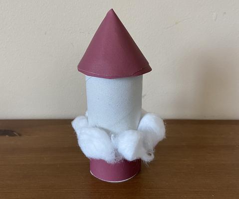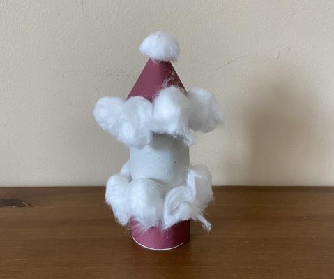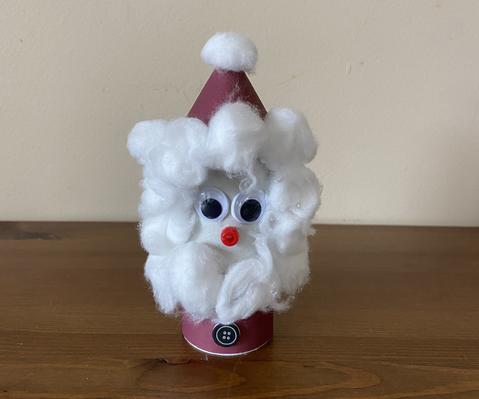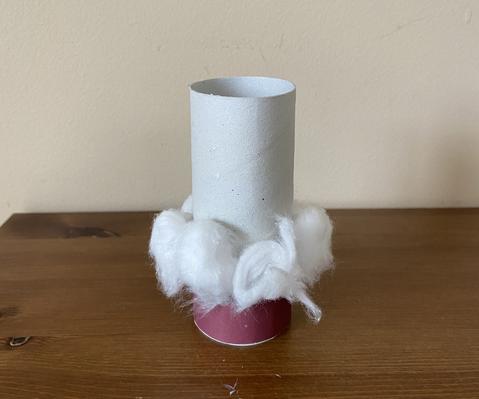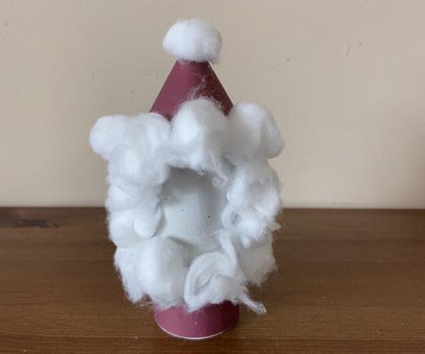Glue cotton balls onto the top of the cone, around the cone and, making a square shape with cottons balls around the toilet paper roll.