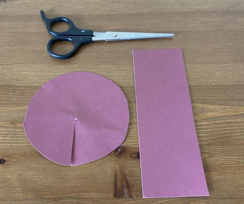 First, start by grabbing your red paper and cut out a rectangle large enough to fit around the bottom half of your toilet paper roll. Also cut out a circle and cut half of the circle stopping in the middle.