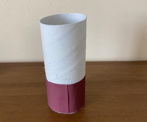 Next, glue the rectangle piece of red paper onto the bottom half of your toilet paper roll.