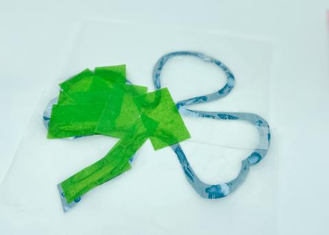 Glue your wax paper to one side of your shamrock frame. Get your small green shapes ready for the next step.