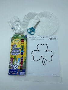 Step 1: First, you’re going to print out the Shamrock suncatcher craft template. Then take washable markers and colour in the coffee filters. You don’t have to cover the entire coffee filter just enough to cover most of the coffee filter.